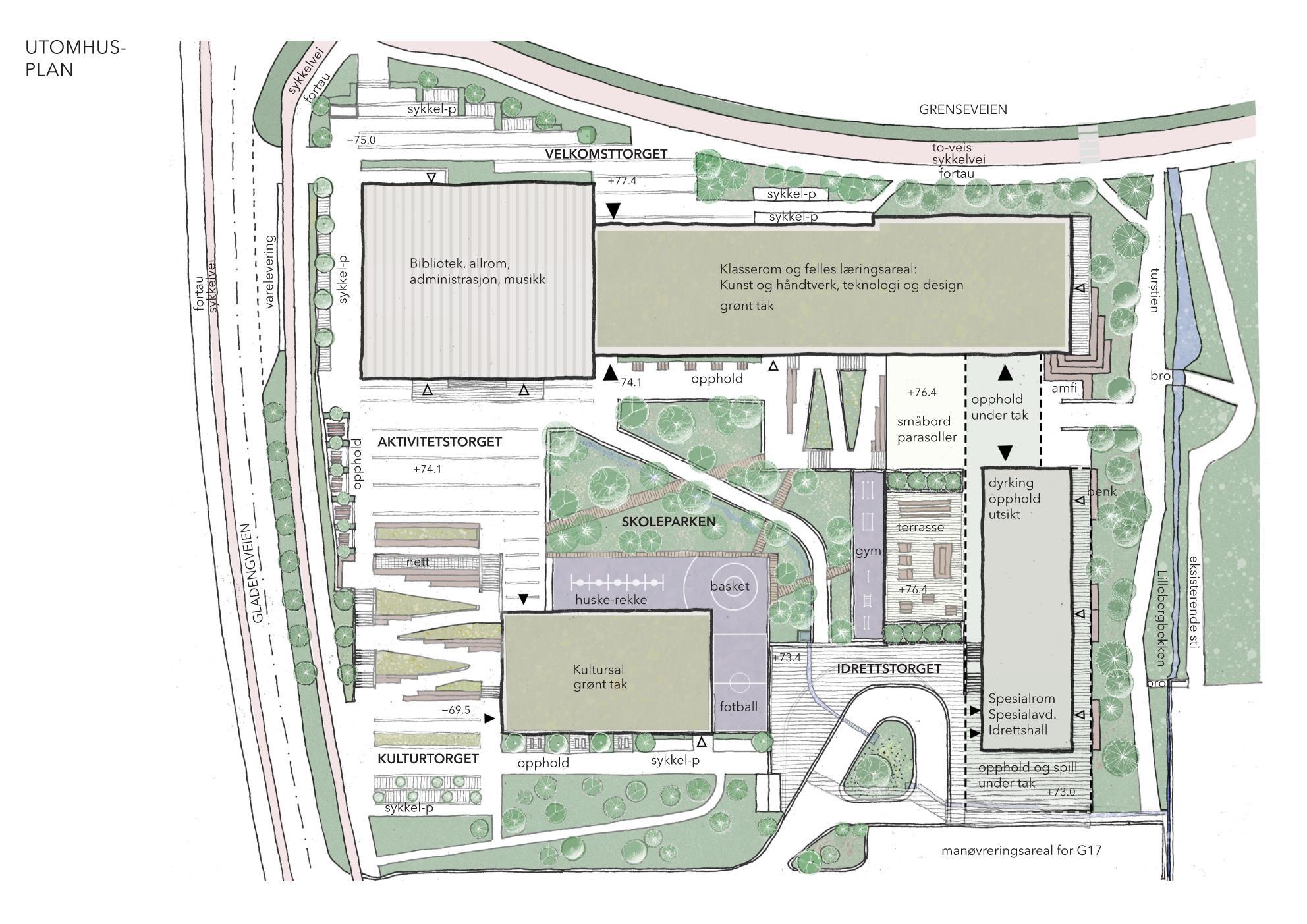 Mailand secondary school is located in what will become Lørenskog's new municipal and cultural center, library and shops on one side of Strømsveien road and City Hall Park and Langevann lake on the other side .