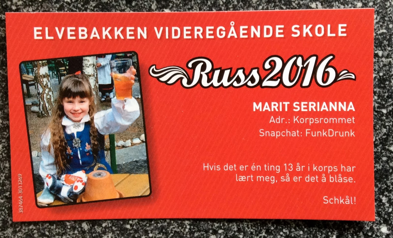 - Du e itj full før bakken kjem opp å slår dæ, står det på russekortet til Jenny Gulbrandsen . ER DITT MORSOMMERE?