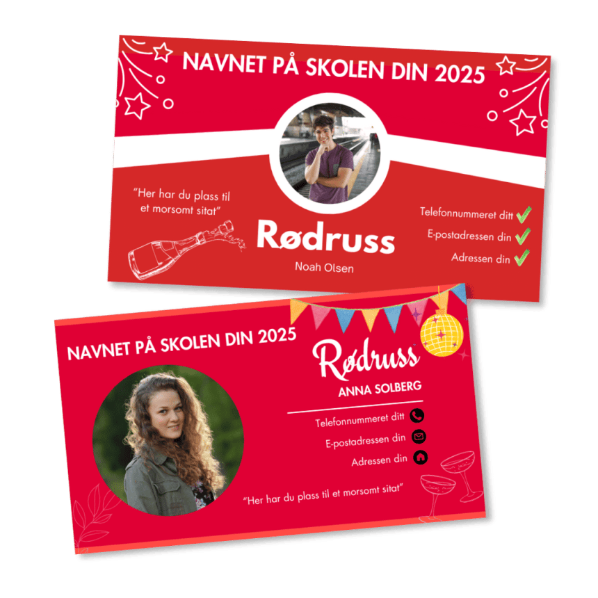 En typisk visittkort pleier å med eksempel navn, adresse, telefonnummer og bilde, men de fleste russ har oftest falsk informasjon og morsomme vendinger .