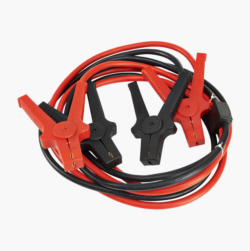 Startkabler av CCA-tråd. Den svarte minuskabelen har en enhet som reduserer risikoen for skader på bilens elektronikk og elsystem . Med myk isolasjon og helis